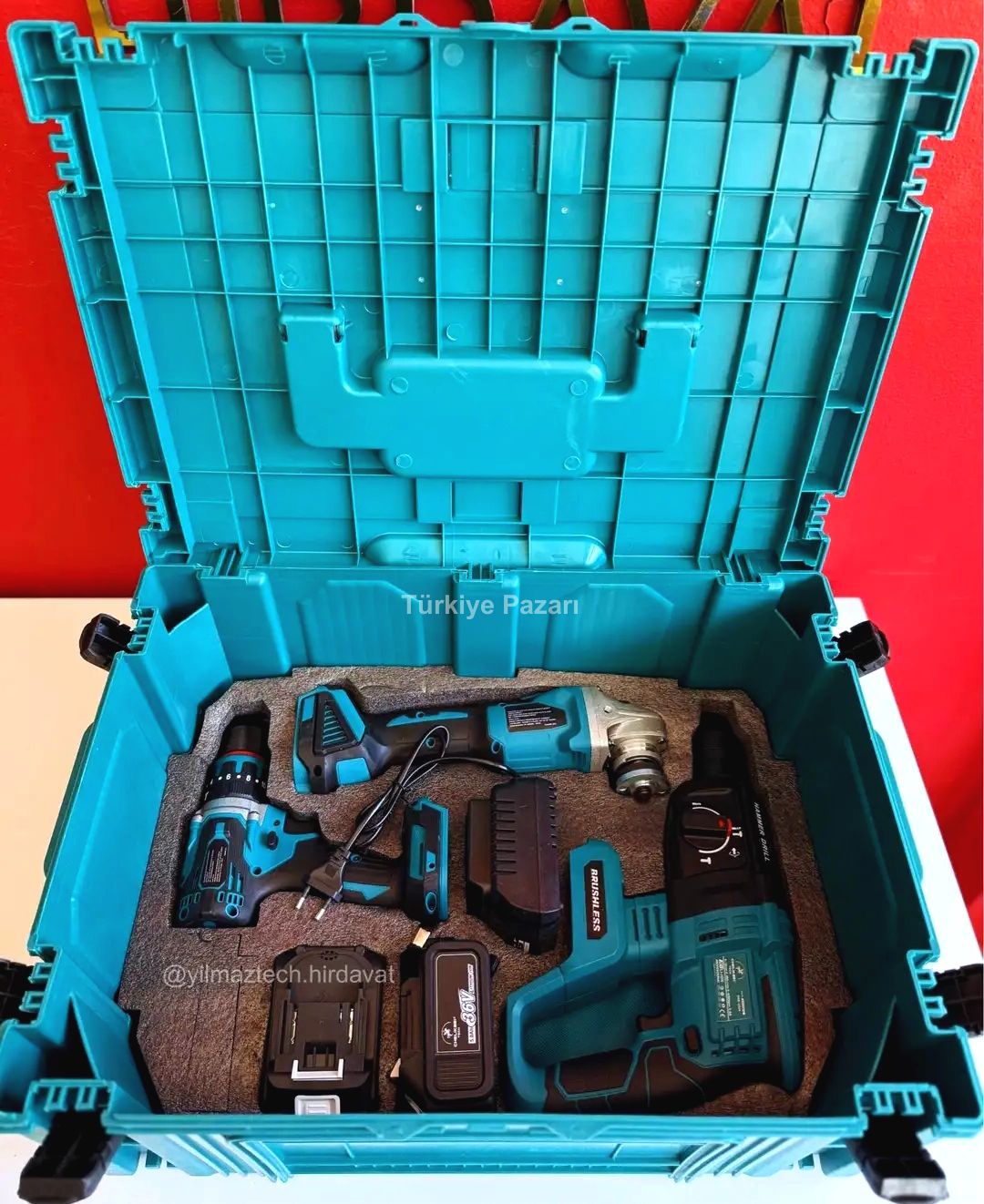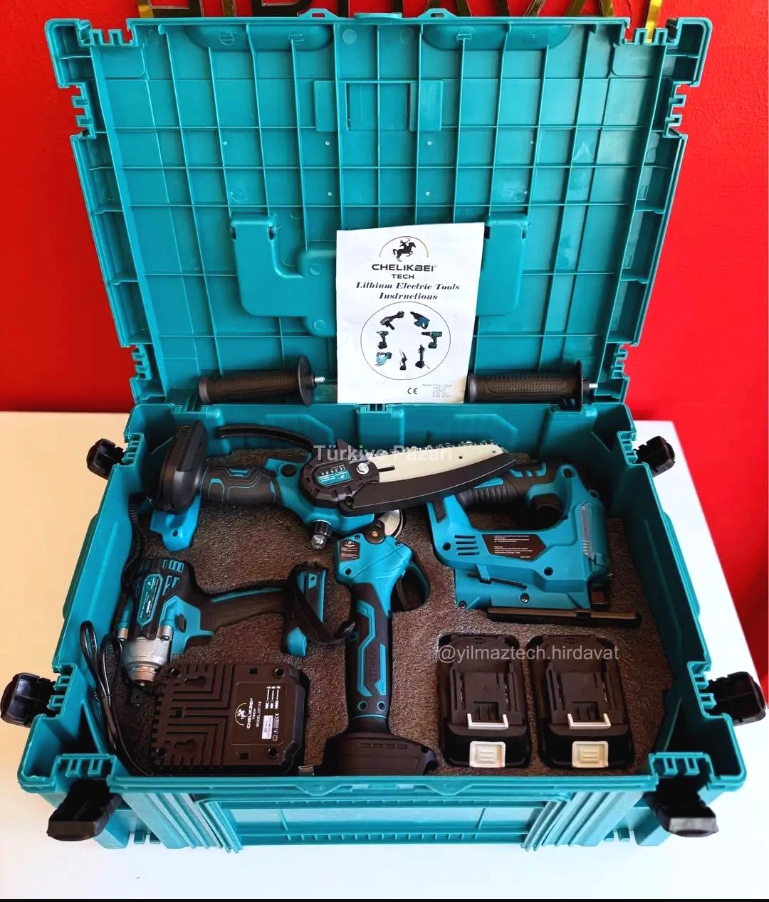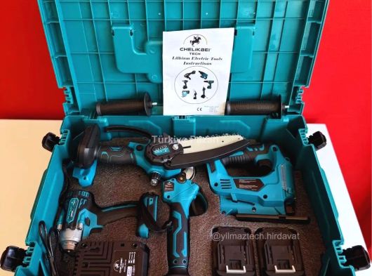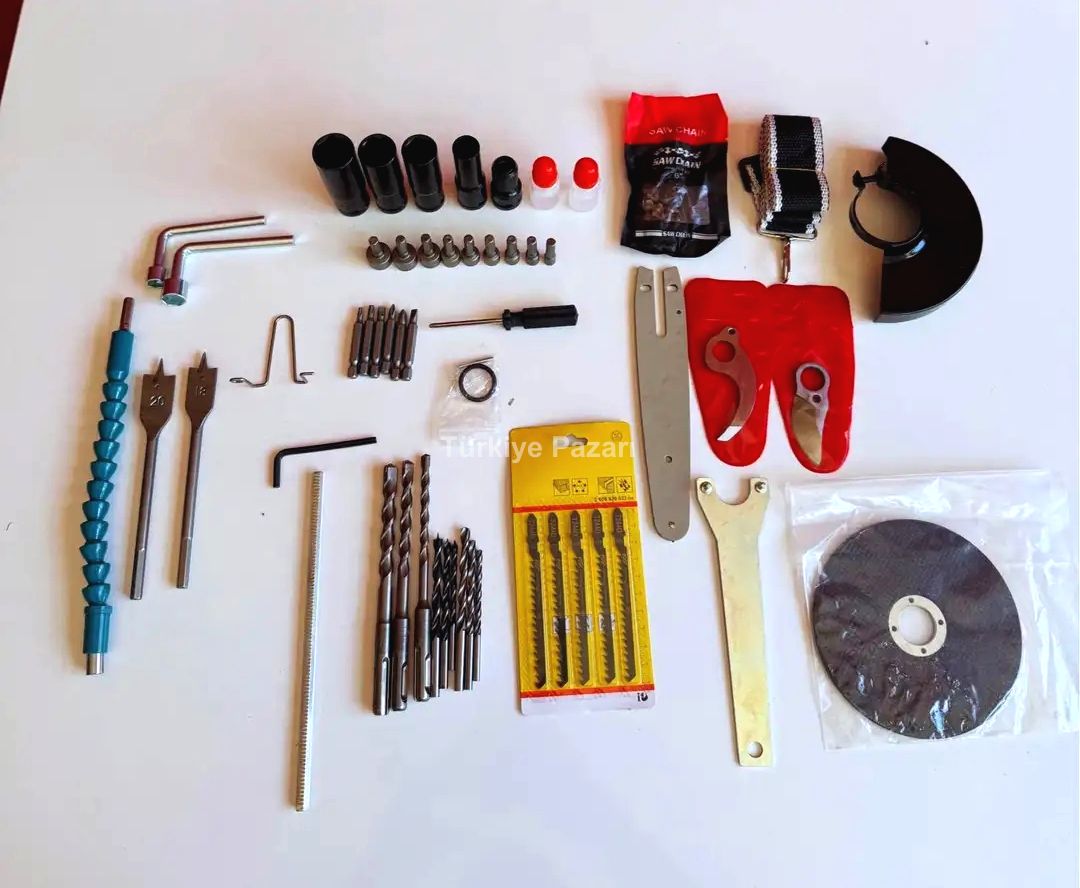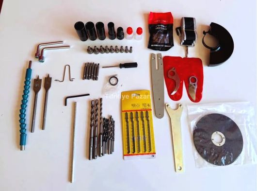 Profesyonel kullanıma uygun olacak şekilde; çantanın içinde 4 adet 10 pilli batarya ve 2 adet hızlı şarj doldurma adaptörü vardır. Ayrıca kırıcı delici hilti uçları, matkap uçları, spiral taşı, somun sıkma için lokma uçları(21 MM, 19 MM, 18 MM, 17 MM, 14 MM), 1 adet zincir yağı, 1 adet pala zinciri, 2 adet makas bıçağı, 2 adet lokma aparatı ve dekupaj bıçakları vardır.